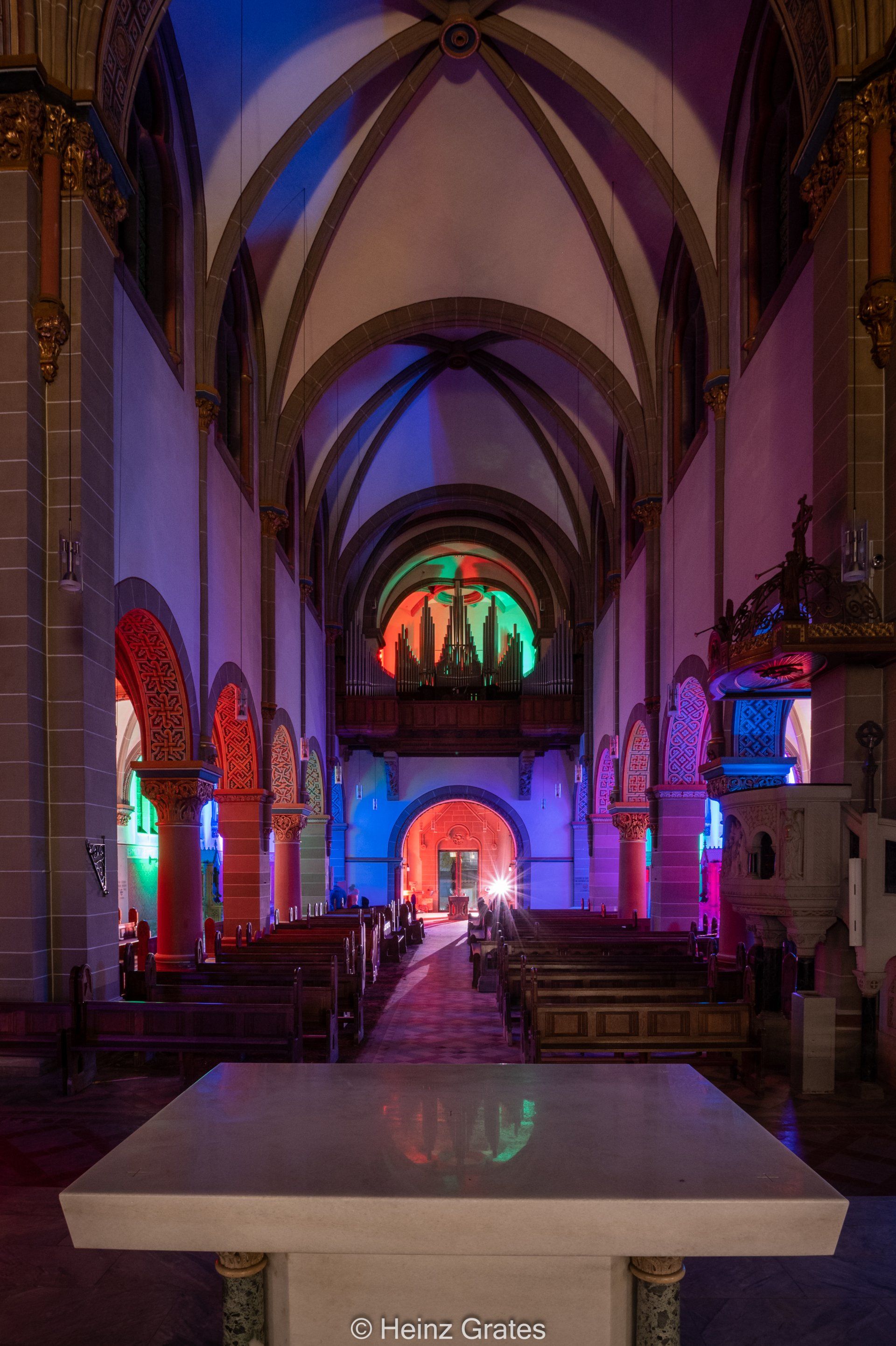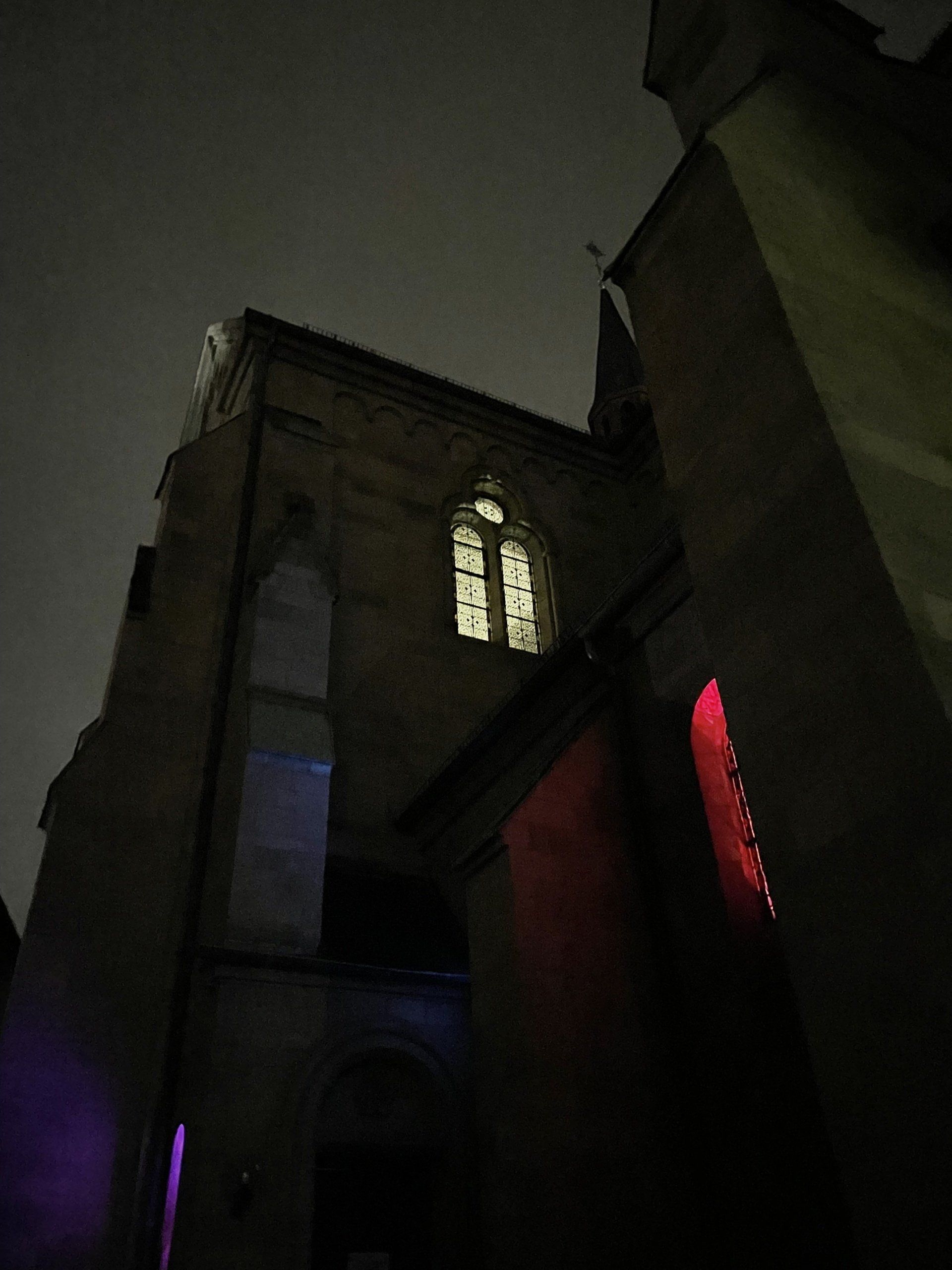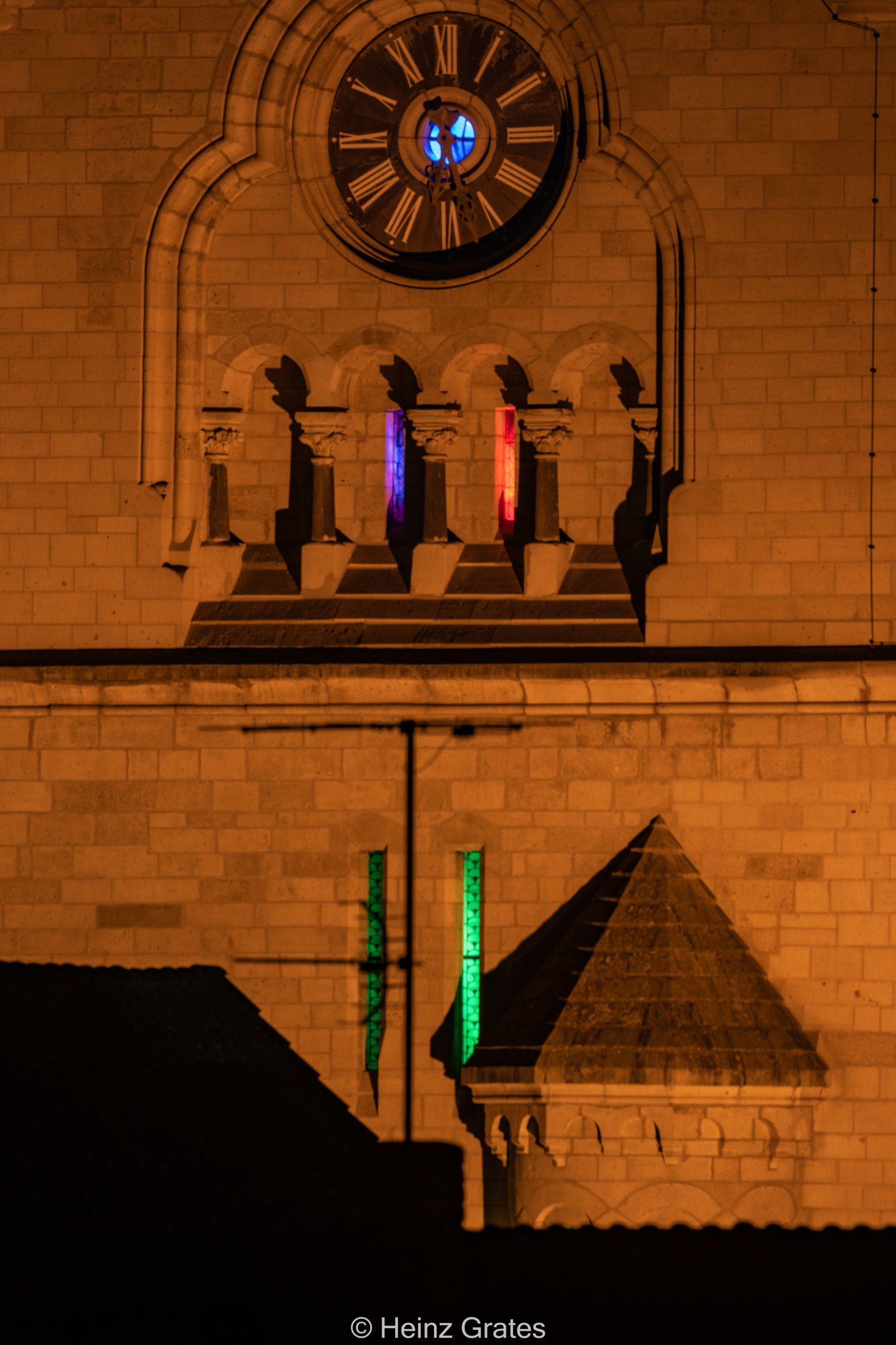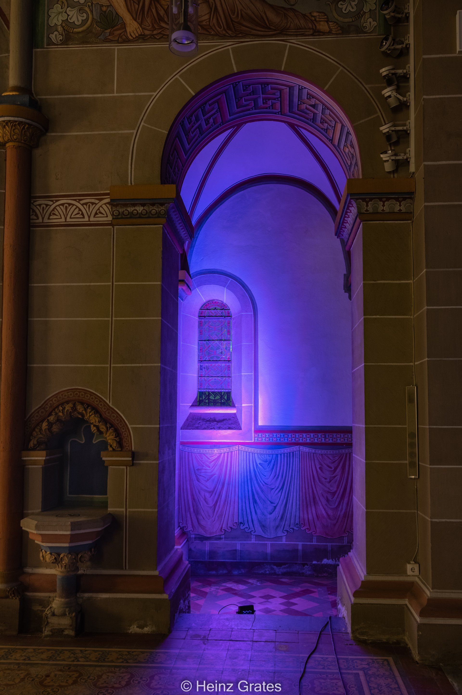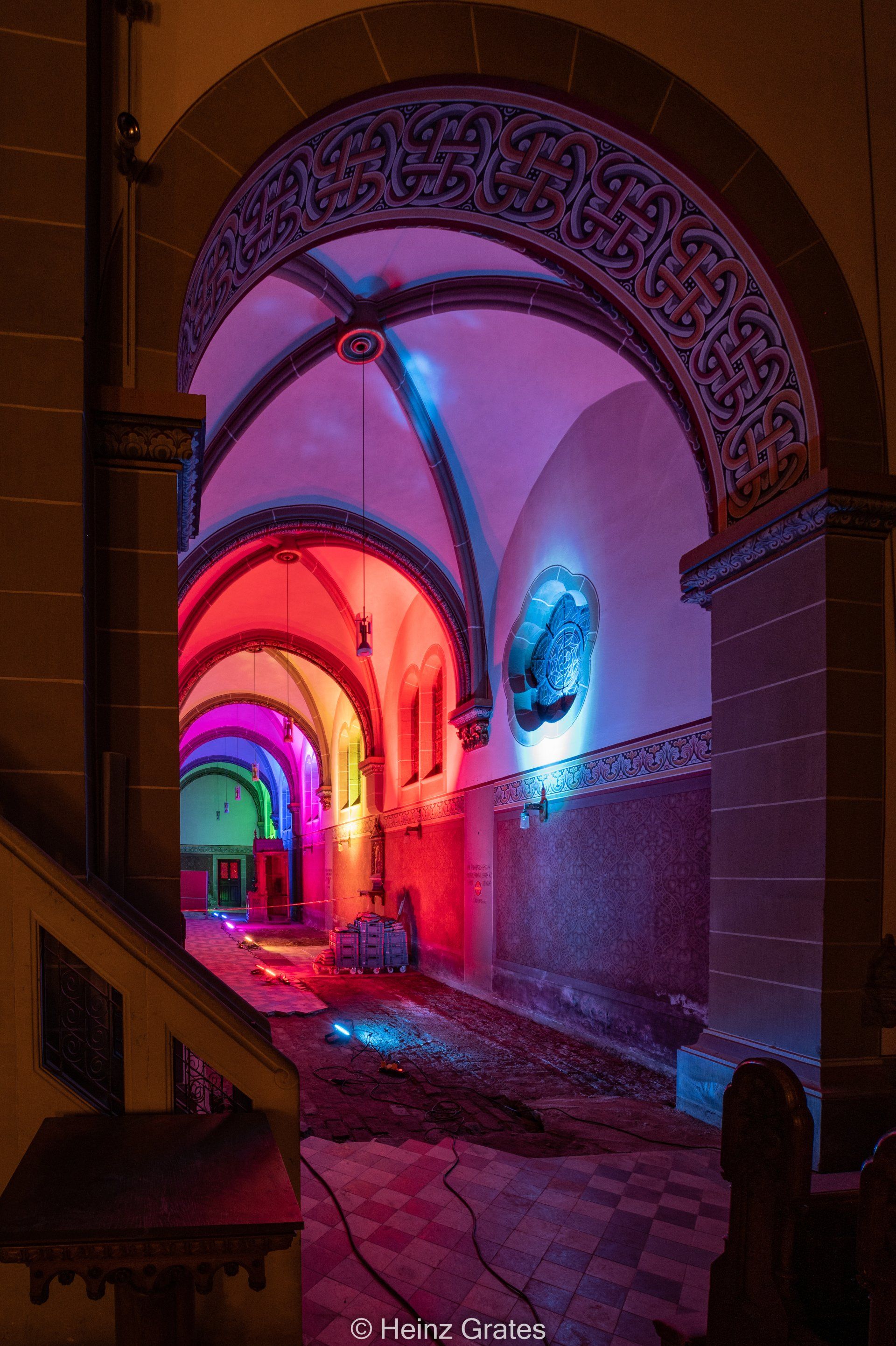 Die Installation in der Rosenkranzkirche in Bad Neuenahr war besonders. Vom 1. Advent 2021 bis Ende Janauar 2022 stählte die Kirche. Über 100 Scheinwerfer haben in einer von der Flut beschädigten Kirche für die Menschen gestrahlt. Es war das größte Projekt von Rafaels Lichtdesign. Eine Installtion zwischen Schäden und Hoffnung.