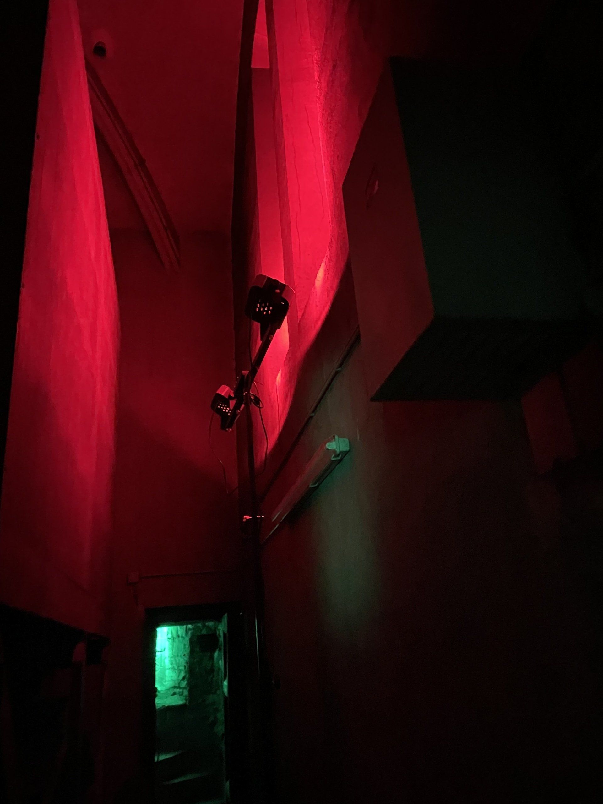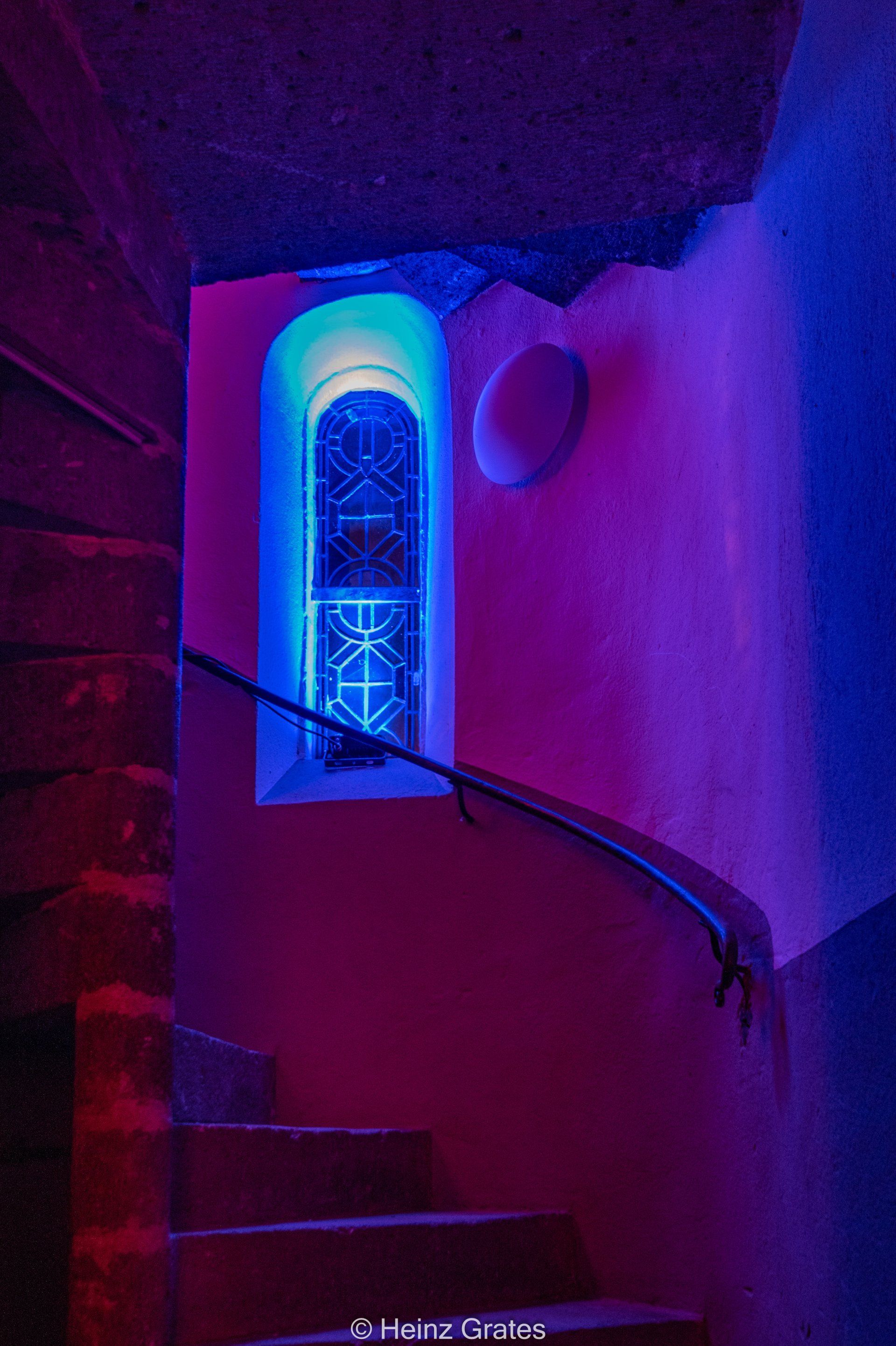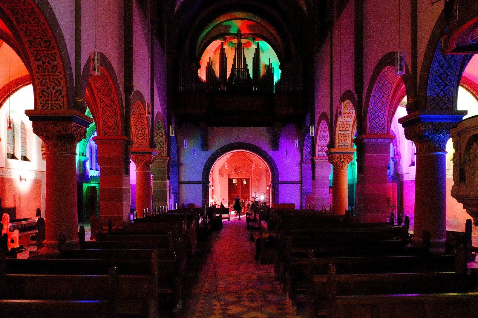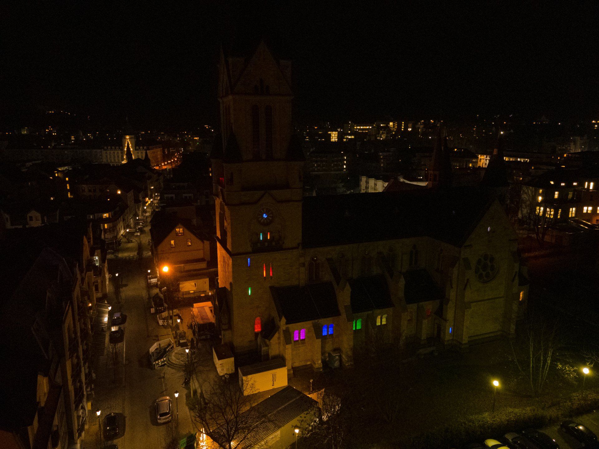 Die Installation in der Rosenkranzkirche in Bad Neuenahr war besonders. Vom 1. Advent 2021 bis Ende Janauar 2022 stählte die Kirche. Über 100 Scheinwerfer haben in einer von der Flut beschädigten Kirche für die Menschen gestrahlt. Es war das größte Projekt von Rafaels Lichtdesign. Eine Installtion zwischen Schäden und Hoffnung.